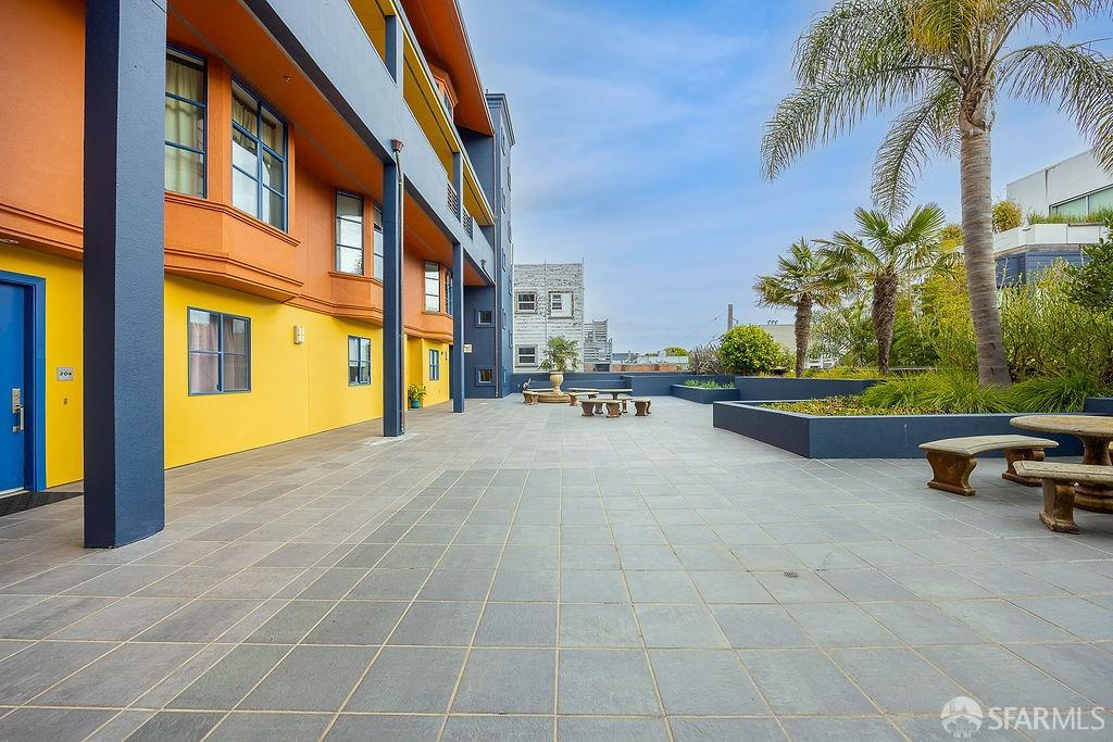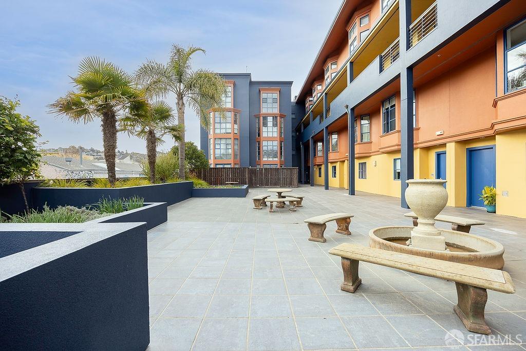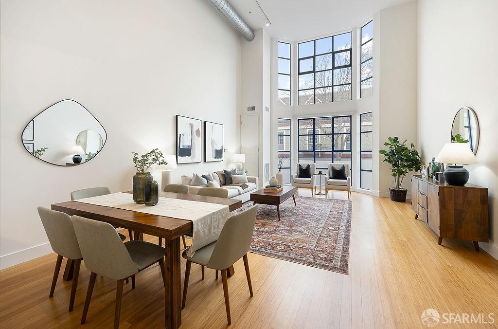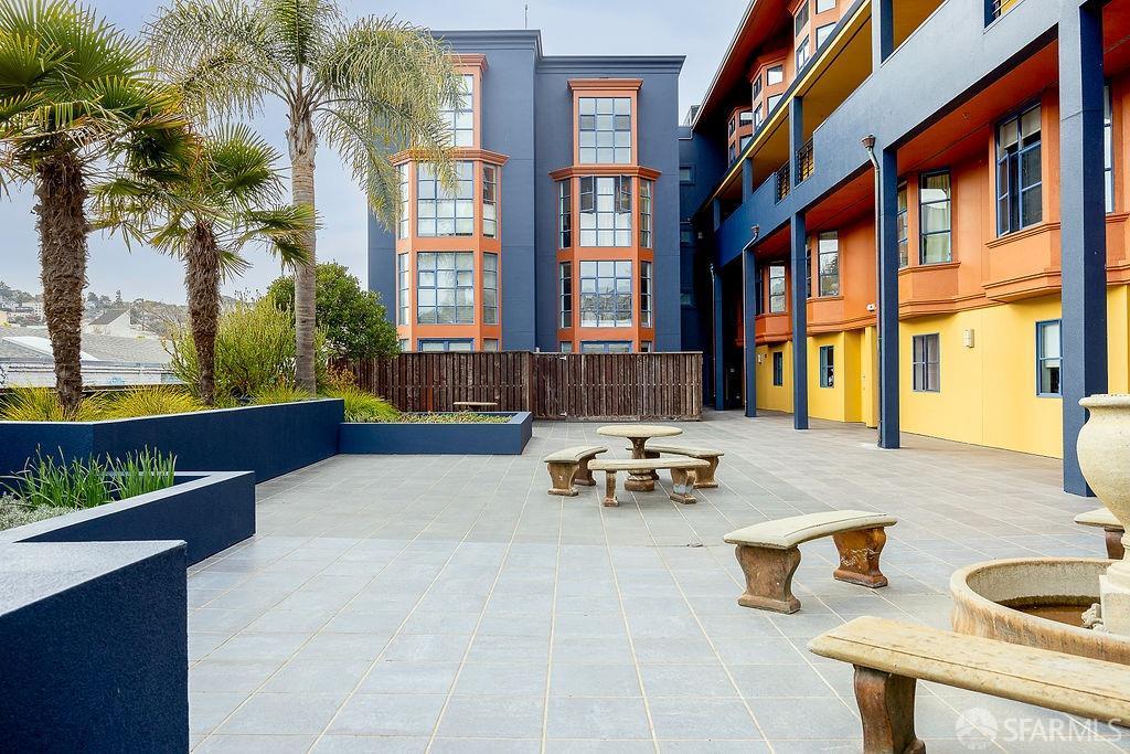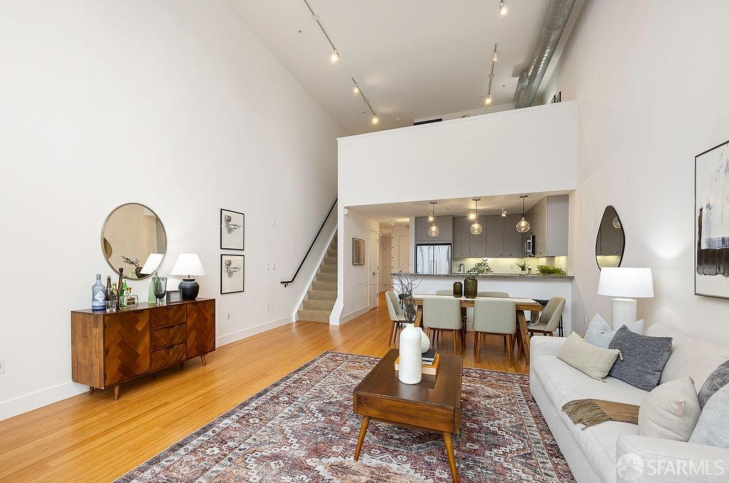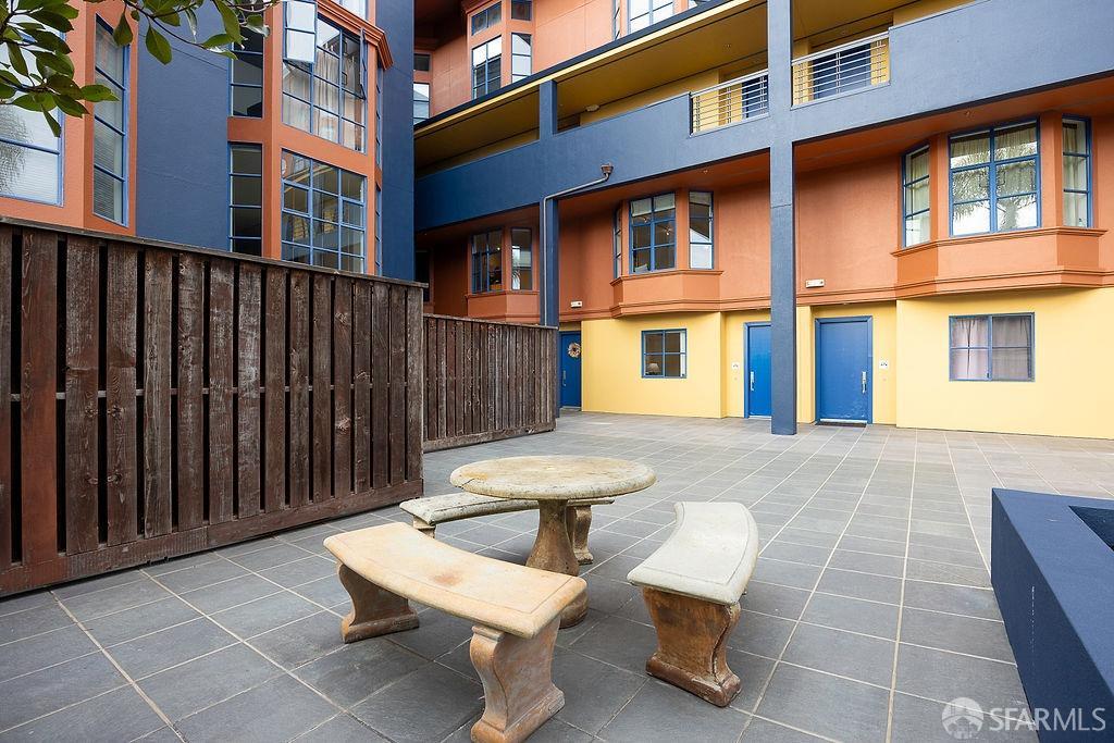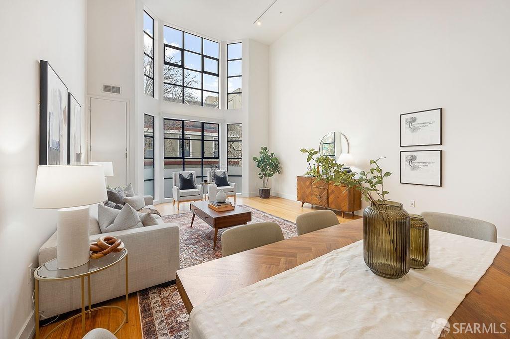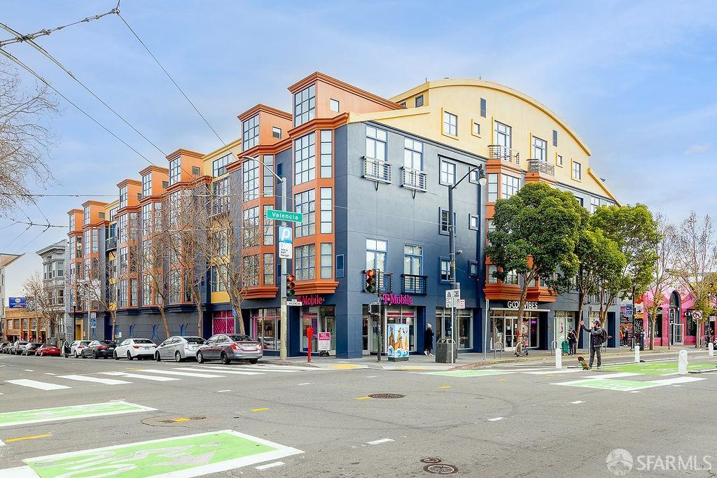 Experience the warmth of home at The Valencia! This contemporary 2-level residence boasts soaring ceilings, a flood of light from expansive windows, 2 bedrooms, 2 bathrooms, a versatile loft ideal for a home office or gym, a stunning kitchen and a generously-sized living/dining area. The well-designed open-concept floor plan is tailored for entertaining, and comes complete with an in-unit W/D and 1 secure garage parking. A vast communal patio offers residents a delightful space to unwind, enjoy coffee, or work remotely. Webpass Internet incl. in HOA fees. Situated in the Inner Mission, this distinctive condo with a 99 Walk Score & 100 Bike Score is just steps from the lively Valencia Street corridor, featuring trendy retail shops and restaurants. Public transportation is conveniently located one block away along with easy access to freeways, enhancing the accessibility of this prime location.