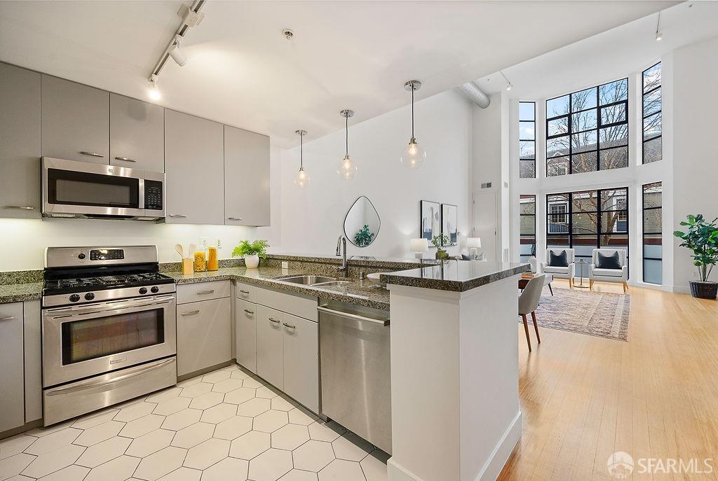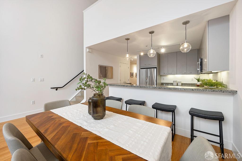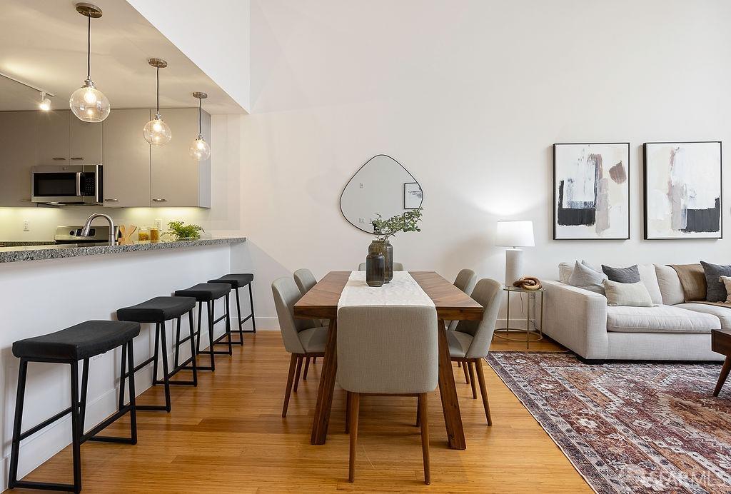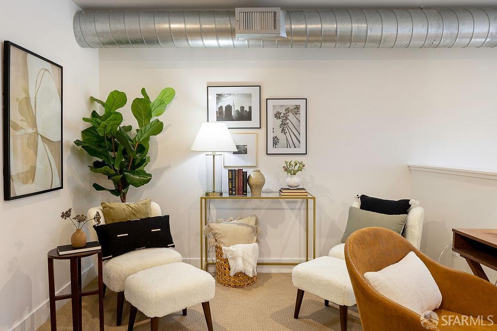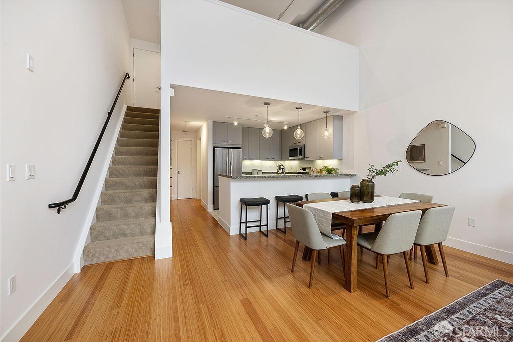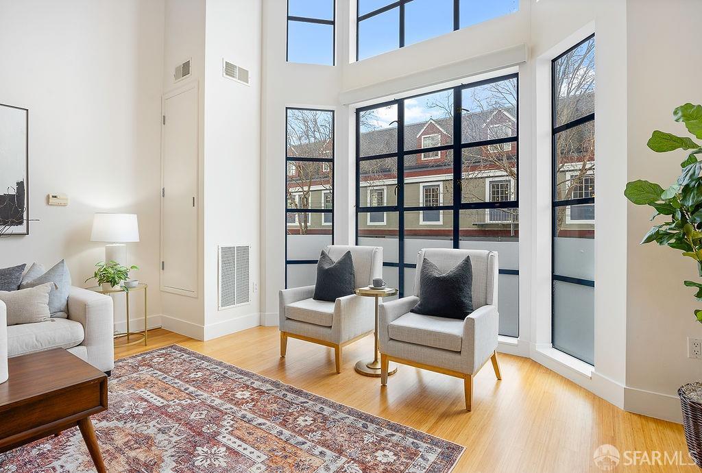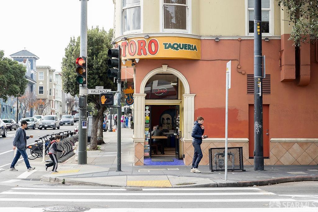 Experience the warmth of home at The Valencia! This contemporary 2-level residence boasts soaring ceilings, a flood of light from expansive windows, 2 bedrooms, 2 bathrooms, a versatile loft ideal for a home office or gym, a stunning kitchen and a generously-sized living/dining area. The well-designed open-concept floor plan is tailored for entertaining, and comes complete with an in-unit W/D and 1 secure garage parking. A vast communal patio offers residents a delightful space to unwind, enjoy coffee, or work remotely. Webpass Internet incl. in HOA fees. Situated in the Inner Mission, this distinctive condo with a 99 Walk Score & 100 Bike Score is just steps from the lively Valencia Street corridor, featuring trendy retail shops and restaurants. Public transportation is conveniently located one block away along with easy access to freeways, enhancing the accessibility of this prime location.